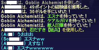 【ネコ】【モンク】で【カンパニエ】しながら【募集中です。】 でも、いざ狩りをはじめてみると 【赤魔道士】さんと“これはやばいですね^^;”なんて話していたら、 なんとか出来ないかなぁと、【忍者】さんの【衰弱】中に で【ケアルワルツ】しまくりになったワケなんですが、 御蔭様で回避【スキル】とガード【スキル】がウナギ昇り。 そんなこんな、【パーティ】中、